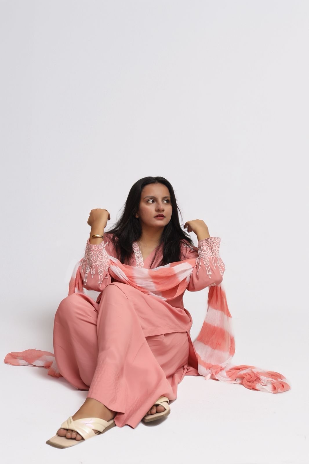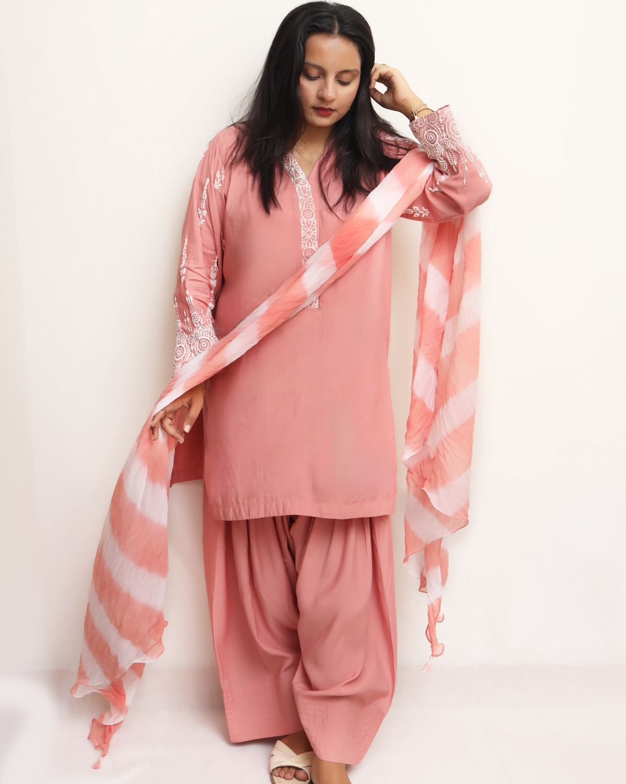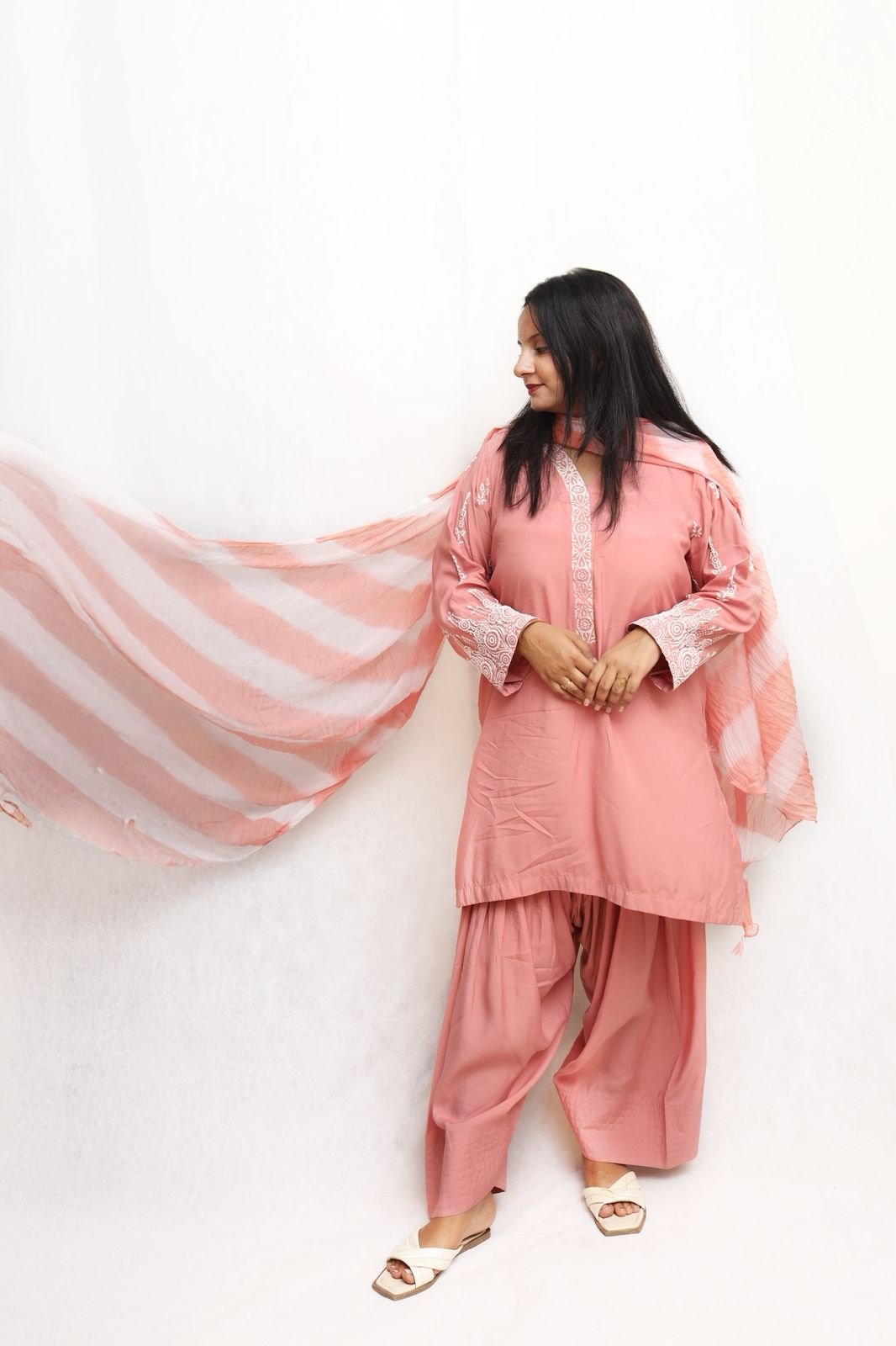This graceful pinkish-toned outfit is a perfect blend of sophistication and charm. The short, straight-cut kameez features delicate embossing on the sleeves and neckline, adding a subtle touch of luxury and refinement.